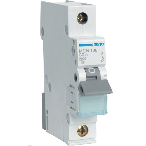 Hager MCN100 1Р 0.5А 6кА- автоматический выключатель модульного исполнения от знаменитого европейского бренда. Авт. выключатель Hager на 0.5А гарантированно защитит вашу электропроводку и оборудование от таких аварийных режимов электросети как: короткое замыкание и токов перегрузки.